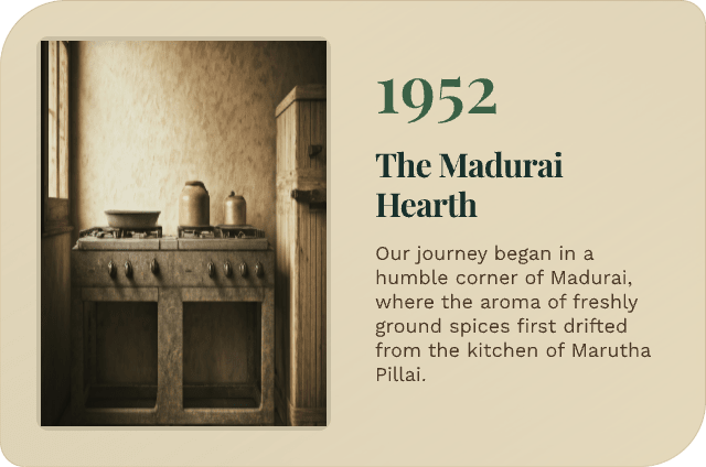Our journey began in a humble corner of Madurai, where the aroma of freshly ground spices first drifted from the kitchen of Marutha Pillai.